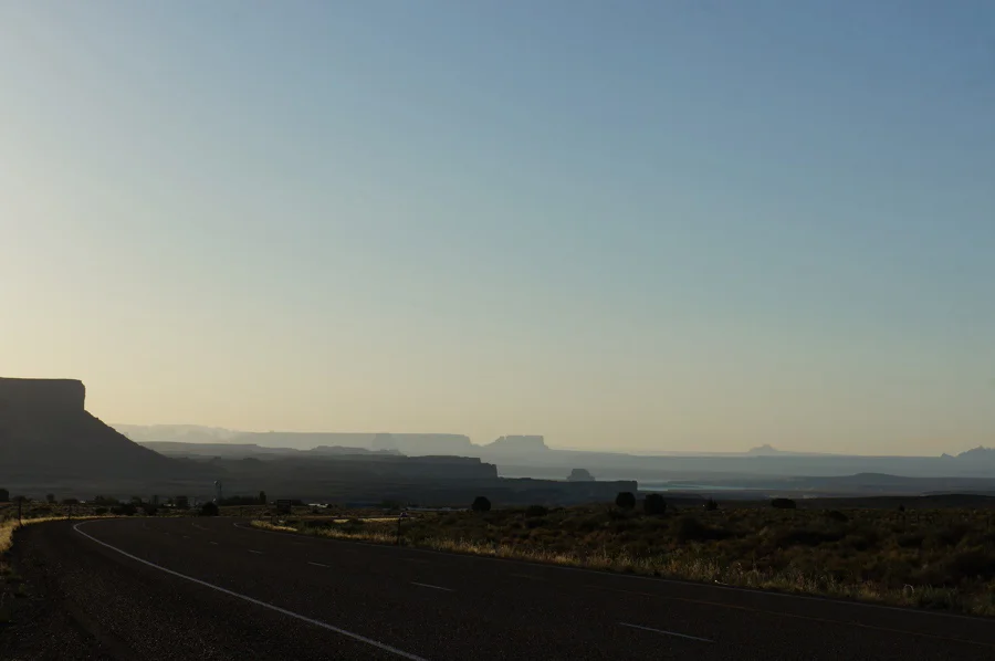 Up at 5am after a very disturbing dream involving my family and a faulty hot air balloon...anyway, up, breakfast in my room, pack (4 litres of water, energy bars, bananas, cheese and crackers, dates, sun cream and camera), then a quick cup of coffee and I'm on the road. The mesas behind me are beautifully misty and I have to stop to try to take a photo. I'm immediately annoyed I didn't bring my other lens.